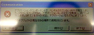 | Communication アプリケーションのコンポーネントで、ハンドルされていない例外が発生しました。[続行]をクリックすると、アプリケーションはこのエラーを無視し、続行しようとします。[終了]をクリックすると、アプリケーションはただちに終了します。 このオブジェクトは現在ほかの場所で使用されています。 [詳細] [続行][終了] |